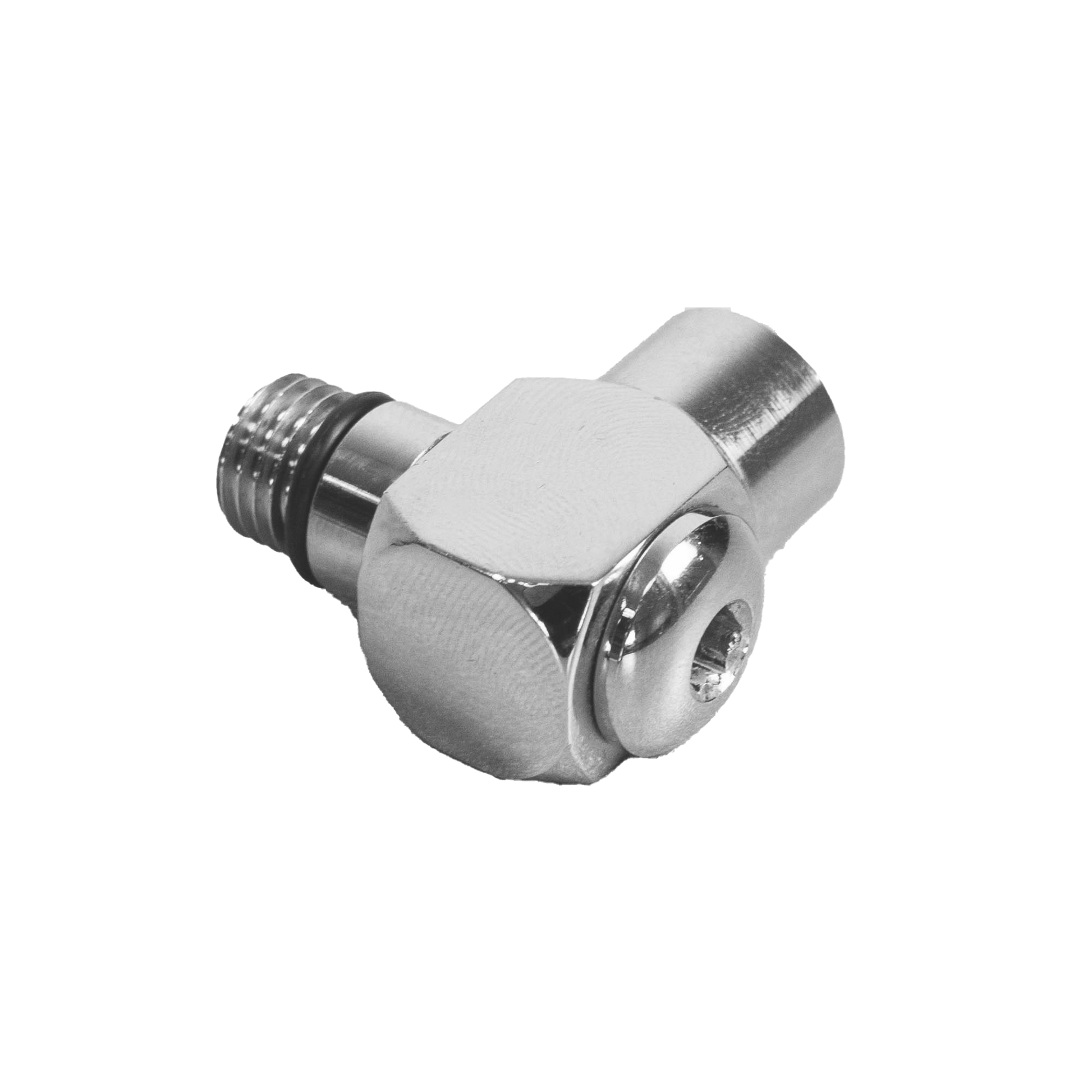 Streamline your first stage and protect your transmitters. The Divesoft HP 90° Elbow creates a secure angled connection for hoses and transmitters, eliminating snag hazards. Oxygen clean.
